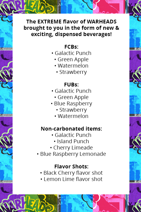 The WARHEADS brand is known for providing extreme & thrilling flavors that offer a sour kick! We have created a flavor forward line of beverages perfect for restaurant and C-Store customers. These unique dispensed beverages are now available in frozen, non-carbonated and flavor shot options! Contact a beverage specialist today to plan your new line up.